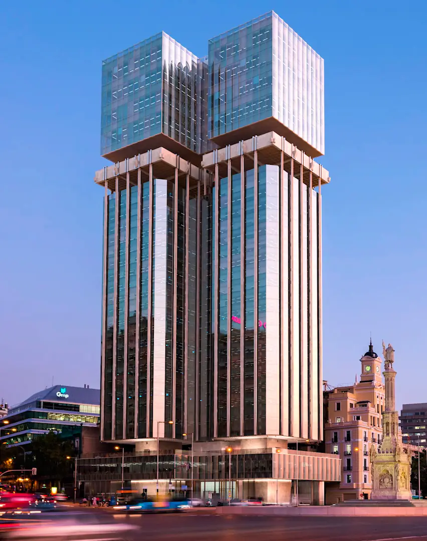 Cuando en 1976 Antonio Lamela construyó las Torres de Colón empleó una novedosa técnica: suspender todo el edificio de unos pilares centrales hasta completar los 88 metros de altura que alcanza, sin los remates que actualmente presenta.